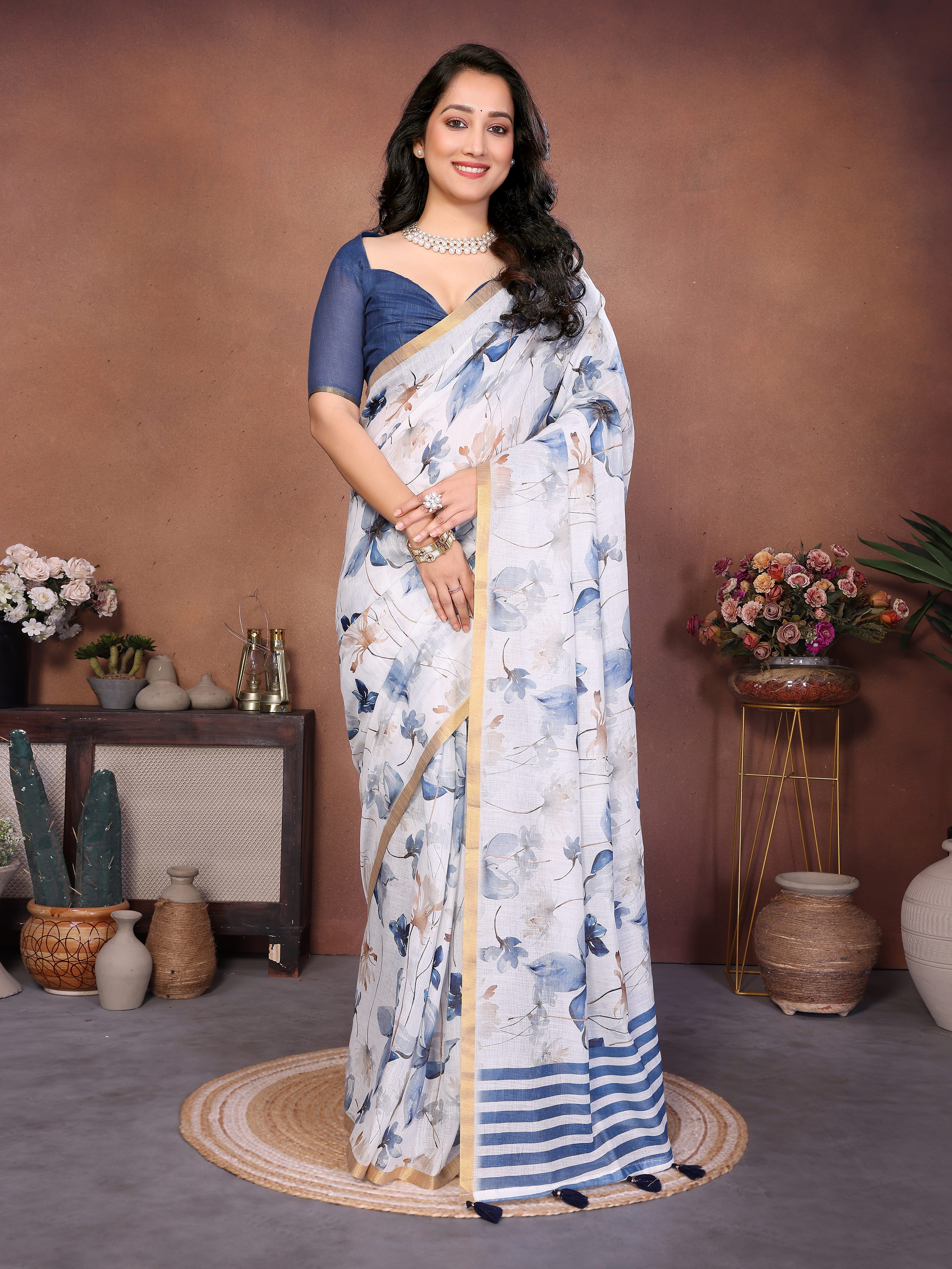 Cream White Blue Floral Ready-...
