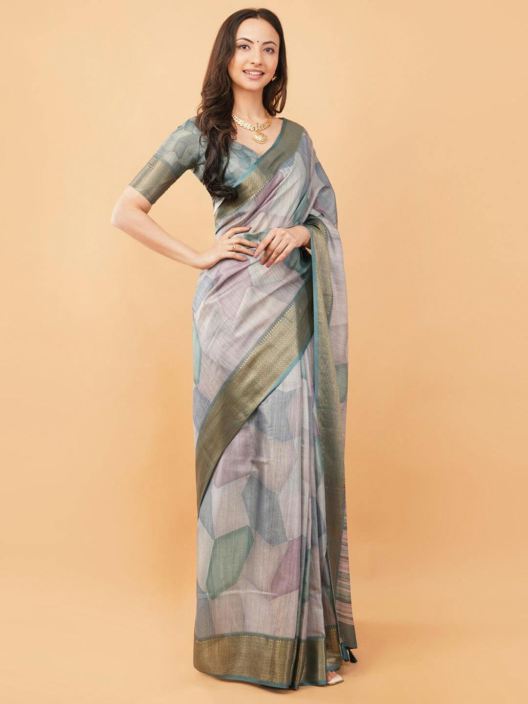 Main corporate job mein hoon aur wahan ke liye ye perfect saree hai. Na zyada chamak dhamak, na zyada simple. Iska geometric pattern bahut smart lagta hai. Kapda din bhar pehenne ke baad bhi comfortable rehta hai. Blouse ka kapda bhi same print ka hai jo acha lagta hai.