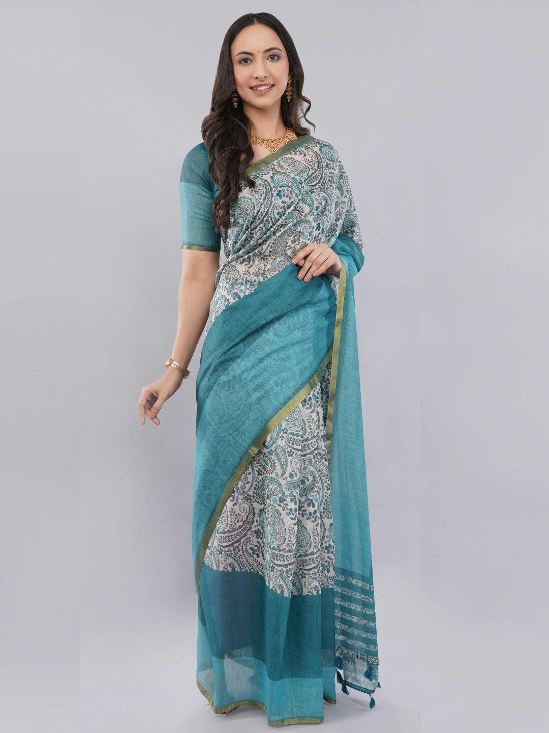 I wore this to a conference and felt very confident. It has a dignified look without being boring. The fabric has a nice texture, typical of good linen. The solid blue blouse contrasts beautifully with the printed pleats. Highly recommended for professionals.